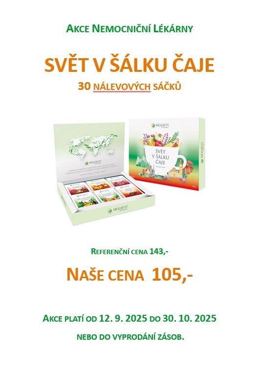 Od 12.9. do 30.10. 2025 nabízí naše lékárna Svět v šálku čaje - 30 nálevových sáčku za akční cenu 105,- Kč.