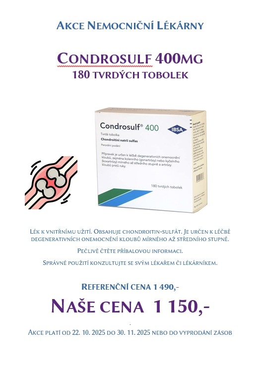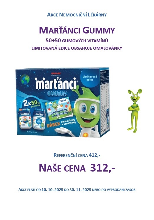 Gumové vitamíny - Marťánci GUMMY - v limitované edici s omalovánkami 50+50 ks a Condrosulf, lék na degenerativní onemocnění kloubů nabízíme se SLEVOU v naší nemocniční lékárně. Marťánky nyní můžete u nás zakoupit za výhodnou cenu 312,- Kč. Akce trvá od 10.10. 2025 do konce listopadu nebo do vyprodání zásob. CONDROSULF pak nabízíme od 22.10. do 30.11.2025 za cenu 1.150,- Kč.