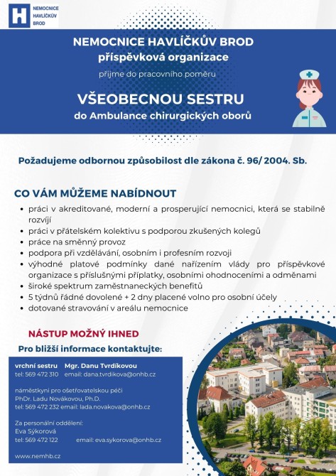 Máte rád/ráda akci? Chcete být součástí skvělého kolektivu? Pro ambulance chirurgických oborů přijmeme VŠEOBECNOU SESTRU! Požadujeme odbornou způsobilost podle 96/2004 Sb.