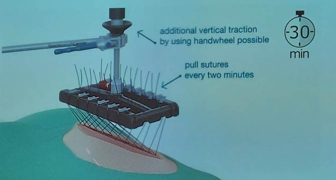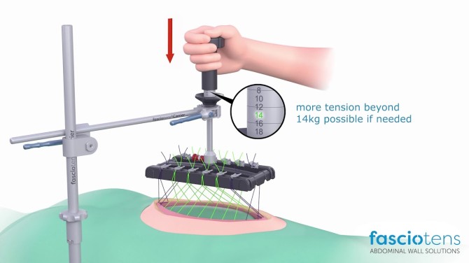 V posledním období jsme začali využívat při operacích větších ventrálních kýl novinku – Fasciotens. Jedná se o přístroj, který v některých případech pomůže uzavřít větší defekty přední břišní steny bez nutnosti rozšíření operace o zadní komponent separaci. Jeho použití snižuje invazivitu operace. Umožňuje použití menší síťky a v neposlední řadě tím snižuje i pravděpodobnost operačních a pooperačních komplikací.