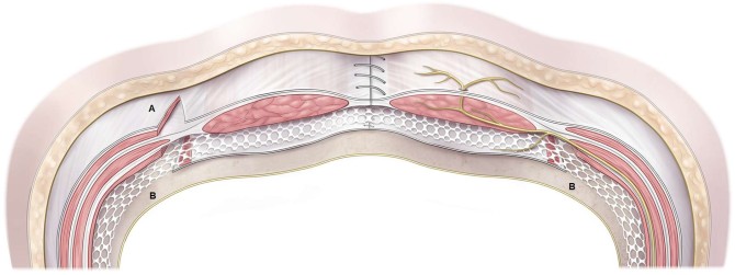 Postupně si chirurgové pomáhali síťkou i při operacích velkých kýl steny břišní, kdy síťku implantovali do různých míst stěny – viz obrázek.