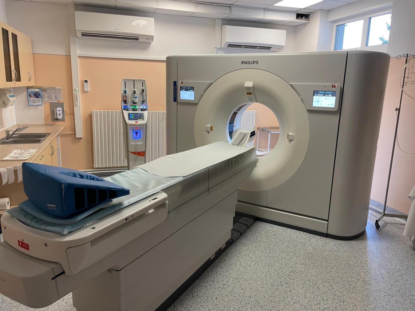 V sprnu 2023 byl na našem oddělení uveden do provozu moderní spirální CT přístroj 6000iCT Pro BRILLIANCE Philips, který několikanásobně urychluje průběh vyšetření na dobu řádově několika vteřin. Tento přístroj nám umožňuje vyšetřovat jakoukoliv část lidského těla tenkými řezy a tím velmi zkvalitnit výsledek vyšetření. CT vyšetření je rychlé a bezbolestné, provádí se buď nativně nebo s podáním kontrastní látky do žíly. Ke kontrastnímu vyšetření pacient přichází nalačno, popřípadě s protialergickou přípravou, kterou zajišťuje indikující lékař.